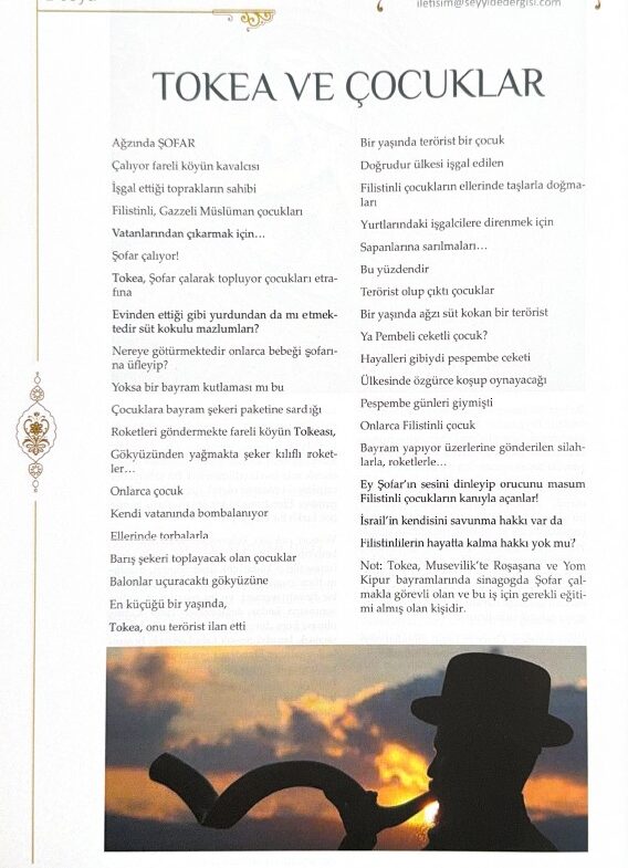 TOKEA VE ÇOCUKLAR Ağzında ŞOFAR Çalıyor fareli köyün kavalcısı İşgal ettiği toprakların sahibi Filistinli, Gazzeli Müslüman çocukları Vatanlarından çıkarmak için… Şofar çalıyor! Tokea, Şofar çalarak topluyor çocukları etrafına Evinden ettiği